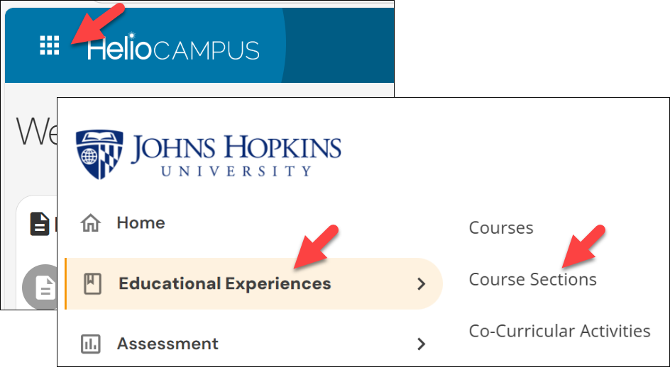- In HelioCampus, click the grid "waffle" menu icon in the upper-left corner and click Educational Experiences, then Course Sections.