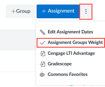 Once all assignment are in the proper groups, the weights can be added by clicking on the options menu at the top of the Assignments page and selecting Assignment Groups Weight.