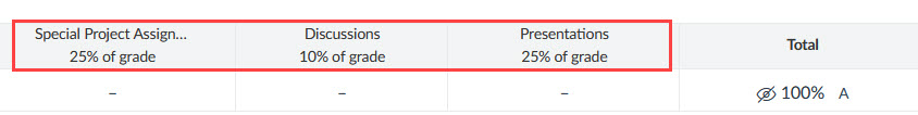 The assignment groups and their weights will appear in the gradebook near the total grade column. The percentages will update as students submit the assignments.