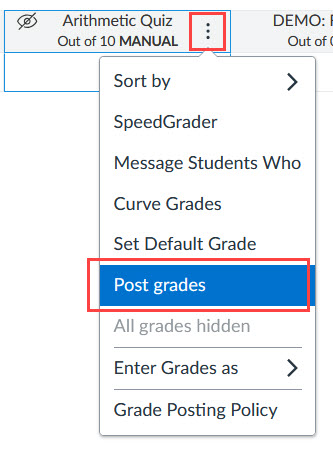 The Grade Posting Policy setting in the grade book has been set to manually post grades, meaning grades will be hidden from students automatically. After grades have been entered in the grade columns, you must select to post grades in order for students to view them. The option to post grades can be found by opening the options menu in each grade book column.